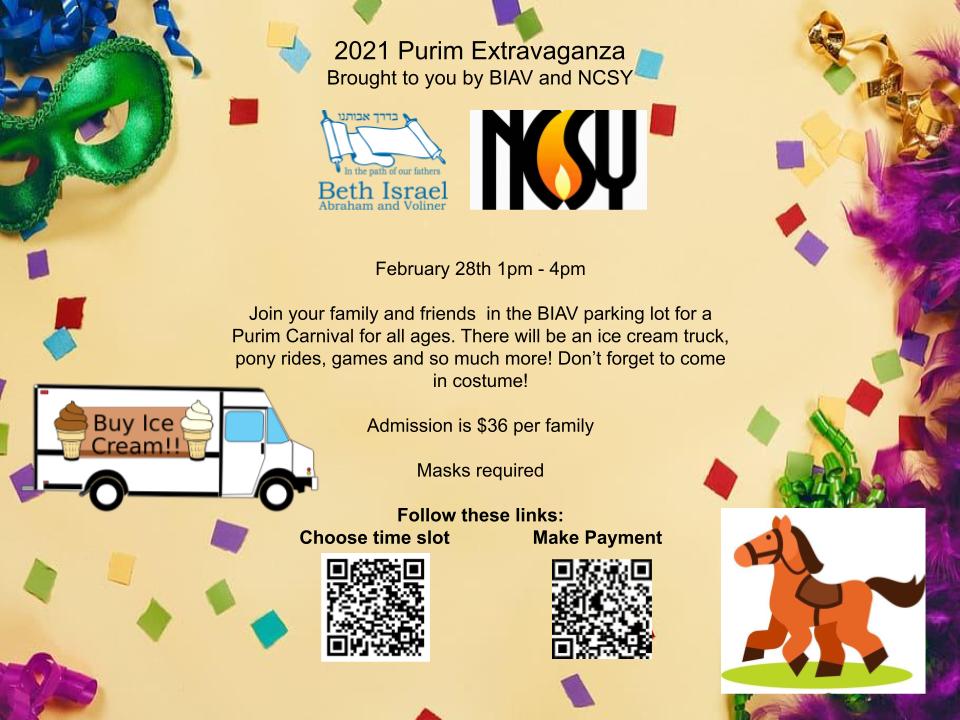 February 28, 2021 @ 1:00 pm – 4:00 pm – Join BIAV in celebrating PURIM! February 28th 1pm – 4pm Join your family and friends in the BIAV parking lot for a Purim Carnival for all ages. There will be an ice cream truck, pony rides, games and so much more! Don’t forget to come in costume! Admission is $36 per family Masks required BIAV […]