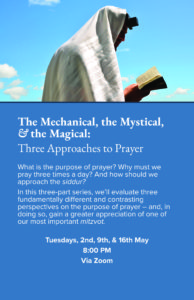 Tuesday Night shiur series: The Mechanical, the Mystical & the Magical: Three Approaches to Prayer (Zoom)